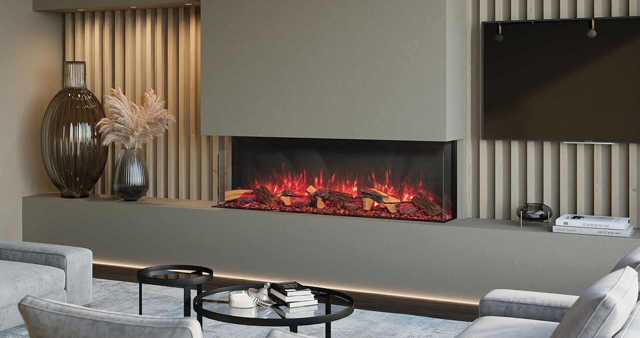 A 59″ Large Premium Electric fireplace with advanced features that can be installed as a 1-sided linear, 2-sided corner, 3-sided bay